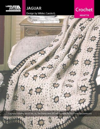 Leisure Arts Contest Favorites Jaguar Afghan Crochet ePattern- A beautiful afghan design selected from almost 100 entries in the Red Heart Afghan Design Contest sponsored by Leisure Arts’ Crochet With Heart magazine. Design features granny squares with a jaguar spot in the center of each that celebrates the majesty of the wild cat. Project can be made using size 4 worsted weight yarn and a US size I-9, 5.5mm, crochet hook. Includes row-by-row design instructions and illustrated crochet stitch diagrams. Finished afghan measures approximately 47 1/2"x 63 1/2". Originally published in Leisure Arts Leaflet 3067, Contest Favorites 40 Afghans to Crochet. 6 pages, PDF download.