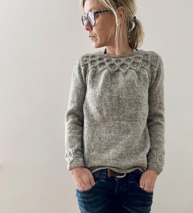 Jakers is worked seamlessly from the top down with a cute lace pattern around the top of the yoke. First some short rows are worked back and forth to create a higher back neck and then the yoke is worked in rounds top down to sleeve separation. Some last short rows are worked to finish the yoke shaping right before sleeve stitches are placed on hold. The body is then worked down to the hem. Held stitches are placed back on the needles to knit the sleeves top down to the lace pattern at the cuffs. No additional finishing required.