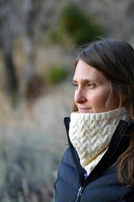 The January Drift Cowl is named after the snow drifts we get in Idaho. January tends to be a stormy month here, and many fields (and roads, unfortunately) are covered with beautiful drifts created by the wind. I wanted to recreate that look with the cables of the cowl.