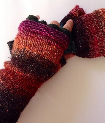 You will need between 50-100 g of Noro Silk Garden (or other Aran weight yarn), depending on how long you want the gloves to be. You will also require less than 50g of fingering weight yarn for the inserts.