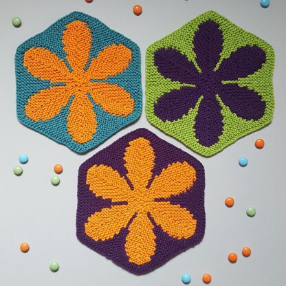Here's a knitting pattern for a hexagonal potholder with a flower motif. It starts with a provisional CO, is knitted in short row wedges and finished with grafting in garter stitch. Since this is an intarsia project with two colours that also uses short rows, it can be quite fiddly. It is NOT a beginner pattern.