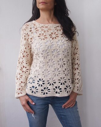 Jasmine sweater is beautiful openwork pullover. Pattern includes written instructions and many photos to show you the process step by step. Very easy to follow.