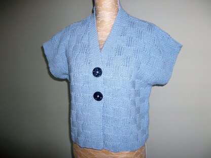An easy fit, useful, cropped bolero style jacket - great for layering. An interesting basket weave stitch, which produces a lovely textured effect. The borders are incorporated into the main body of the pattern, which means there is little sewing up to do!