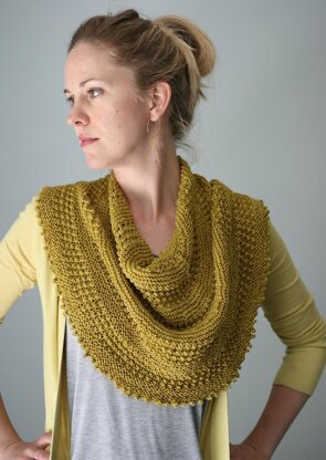 The Jeera Shawl-Cowl is a hybrid piece. It is knit like a cowl, but designed to look like a semi-circular shawl draped around the neck. It is worked in alternating bands of garter stitch and a very simple textured openwork stitch pattern and begins as a shawl knit flat. When the top edge reaches the appropriate length, the two ends are joined and worked in the round to the end. A picot border finishes the piece.