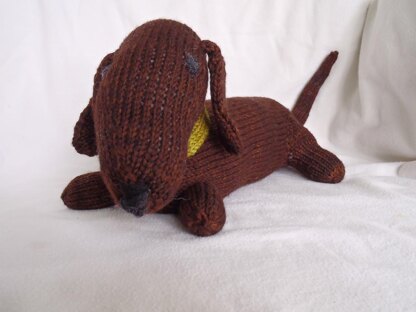 This adorable Jelly, the dachshund is knitted in the round. The head, and paws are knitted separately and sewn onto the body. The collar is removable.