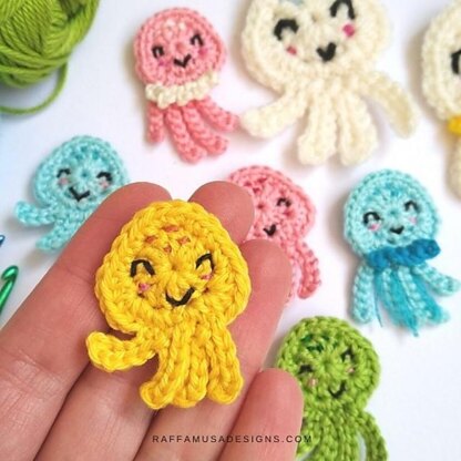 For example, if you use DK yarn and a 4-mm crochet hook, you would get: – A jellyfish applique of about 3.15” (8 cm) by 1.77” (4.5 cm) – An octopus applique of 2.76” (7 cm) by 1.77” (4.5 cm).