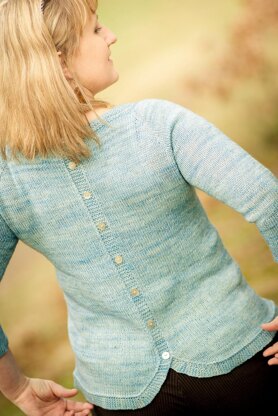 Jessais a simple top-down pullover perfect for the upcoming spring. The sweater is worked in Stockinette stitch with a Garter stitch faux button band running down along the spine, which flows into the bottom hem. Small mother of pearl buttons and the eye-catching curved edges give the design a unique touch.