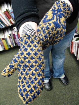 These toasty, rustic mittens are named for the jessant-de-lis, though they feature the more commonly known fleur-de-lis. Complicated looking but quick to execute, the motif is surrounded by a simple diamond pattern, with ribbing, gusset increases, and finger decreases neatly integrated into the colorwork.