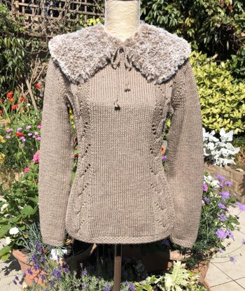 A gorgeous vintage style sweater, worked in stocking stitch with panels of diagonal eyelets intersected by a centre cable. Some easy decreasing and increasing is included at each side of the lower panels to give gentle shaping which enhances the vintage appeal. Sleeves are set in and the borders are worked in slip stitch to match the lower edge. For a truly sumptuous look and feel, make this separate fur effect collar, worked in 2 pieces with a centre back seam, and ties at the front. Full written instructions given.