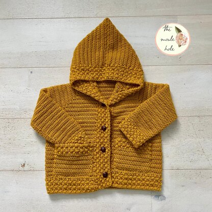 This is a raglan style cardigan and is worked from the top down. The hood is added and then each sleeve.