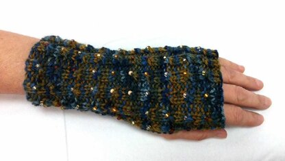 Mitt is worked in the round. 6/0 Beads are applied to the cuff and back of hand, leaving the palm free of beads for better grip. Twisted stitches are worked on right and wrong side rows - without a cable needle. This quick project is knit in a yummy wool/silk blend. You won't want to take them off!