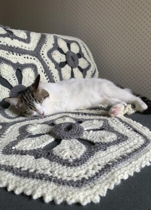 With this pattern create a lap blanket that consists of large dimensional flower motifs. Each flower center is in relief, while the contrasting colors and various stitch patterns give textural interest to the rest of the panels.