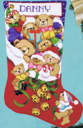 Designed by: Linda Gillum. Creating a cheerful Christmas look has never been easier. With our cuddly bears stocking design and jolly jingle bells spilling out, you can add a fun touch to you décor, or wrap it up for a gift. This easy-to-stitch piece can be personalized with a child’s name or initials.