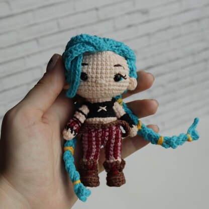 Jinx Amigurumi is the daring heroine of the animated series "Arcane". She has bright blue, long braids and a dark suit with pink and purple accents.