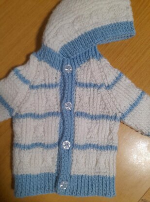 Baby hoodie, size - 0-3 months, 16” chest. Actual size chest 16", length 9", sleeve 5.5" Knitted in one piece to armhole in a rib, cable and garter stitch design with cable detail on sleeves and edge of hood. Suitable for boy or girl.