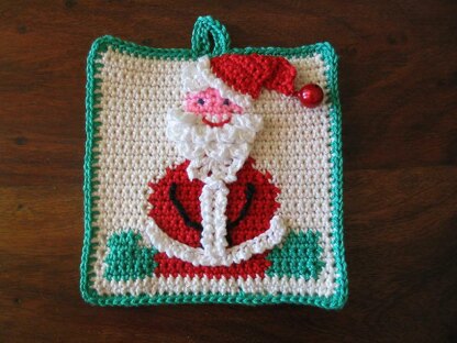 What could be jollier than a Jolly Santa. This double thickness potholder features a laughing Santa on the front,complete with beard and fur edged jacket, and his red hat has a jingly jingle bell on the end. I have really enjoyed hooking this potholder, and hope you will too.