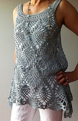 This feminine sleeveless top is worked from the collar down in one piece. The pineapple stitch pattern and increases are worked into the skirt to create an asymmetric hemline. The end result is a beautiful garment that drapes lovely around the body.