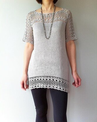 Combining crochet and knitting with sophisticated dimension, Julia is effortlessly stylish and feminine. The beautiful crocheted floral lace brings eye-catching details to the yoke, sleeves and hem. Knitted top-down directly from the lace yoke in the round, the Stockinette stitch body with its gentle A-line is simple to make and flattering to wear. The unique seamless construction creates a moderate high-low hemline that further adds a chic modern twist to this exquisite piece.