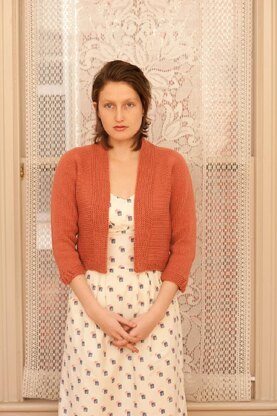 I love working a simple stitch detail into an otherwise unadorned sweater. In this little cardi, worked sideways to center front and back, a little fan motif on the garter stitch cuffs flows into a pair of purl ribs that extend to the neckline. The pieces end at the center back with a few rows of garter stitch to create a vertical panel. I joined the pieces with a three-needle bind off, but you could graft them, if you prefer. The collar, more simplicity, is picked up and worked in garter stitch.