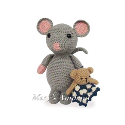 It is crocheted in one piece starting from the feet up to the head. Only ears, muzzle and tail are sewed on separately. I used a pipe cleaner to make the tail pose-able. The mouse comes along with a bear lovey and the blanket is based on a classic granny square pattern.