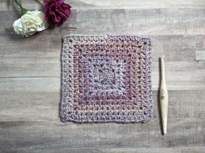 This crochet square starts in the center with traditional granny stitches, and then is worked in turned rounds in the cluster stitch. The cluster stitch creates a subtle texture.