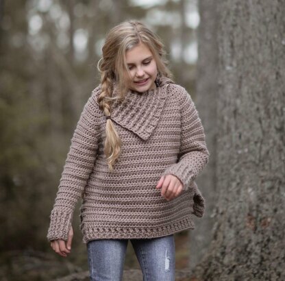 The Juniper sweater is designed with a positive ease of approx. 6-10 inches. Pictured in size 10/12 with a positive ease of 9 inches.