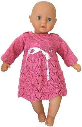 This is a beautiful little dress that begins with the Bear Track pattern for the skirt worked in round, then the top and sleeves are worked in Stockinette stitch. The dress buttons on the shoulders for ease of wear.