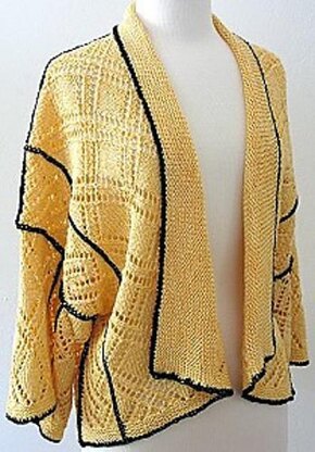 This is a design based on the shape of a Japanese kimono. It is roomy and very easy to wear. That is why the design has only one size. The front and back follow two different lace patterns that are worked in strips and then joined with a contrasting color. It is easier to work this kind of design, rather than following several different patterns at once in one large piece. In addition, the joining of strips with a different color, gives a new dimension to the work, creating an interesting look.