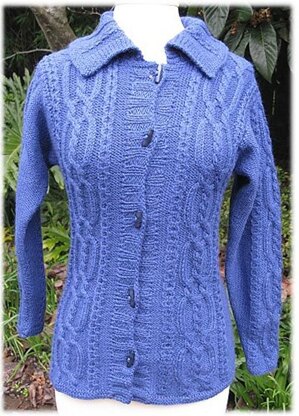 Golden Gate Park is an Aran fitted cardigan with a collar that follows the same pattern as the body. This drop shoulder cardigan has long sleeves. The same cable patterns are worked along the sleeves creating a beautiful look.