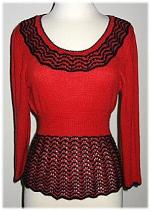 At first, I called this design "Welcome Spring", because it was published in April. Now that I look at the colors, I realize that is more appropriate for Christmas, hence the name change. This is a beautiful top with the skirt worked in a bicolor Feather and Fan variation. The waist is worked in k1, p1 ribbing to pull in and the rest of the body and ¾-length sleeves are worked in Stockinette stitch. The round wide neckline is decorated with the same ruffle as the skirt. The sleeve cuffs have decorative Garter stitch edges.