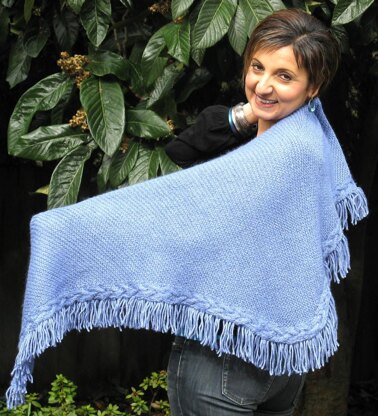 This is a shawl worked from side to side with a beautiful cable pattern at the edge. The rest of the shawl is worked in Garter stitch. Five stitches at the edge are knit in Stockinette but are never bound off. They are unraveled to create a nice fringe for the shawl. There is no need to add the fringe after the shawl is finished.