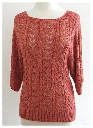 This beautiful loose-fitting top is worked in two pieces with the stitches for the sleeves added to the body stitches to create the dolman shape. The front and back are joined with 3-needle bind-off technique. The front neckline is wide and round, perfect for warmer spring weather. The pattern used for this design is a lace and cable combination.