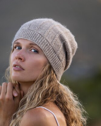 Kalahari beanie is worked flat sideways, using short rows to shape the crown. It is made of several wedges. When the knitting is finished, the first and last rows are grafted with Kitchener Stitch, the tips of the wedges are also cinched together to close off the crown.