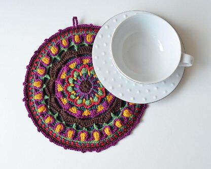 This Mandala Potholder has two layers: lace colorful top and a flat circle made of dc’s as a bottom. When not used in the kitchen it can be hung on a wall. And if you don’t crochet a bottom part for this pot holder it can serve as a decoration for a table or a nice appliqué for your old (or new) pillow cover.