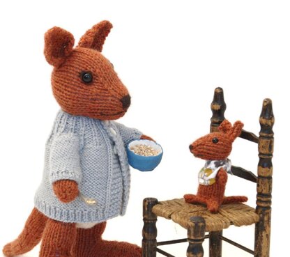 The Kangaroo is about 10" tall when finished, and has a little pocket for the joey. The Joey is a finger-puppet, which makes it fit easily in the pocket, and is extra fun for kids to play with. The Cardigan has 3 variations: sleeveless, sleeves knit in the round, or sleeves knit flat (the second two look the same when finished). You can also place buttons just on the yoke, or down the whole front.