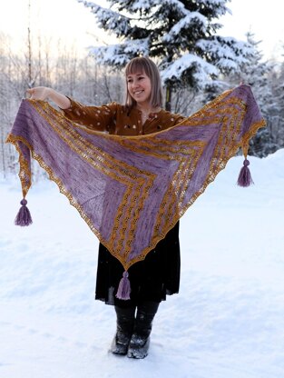 Karamelli Shawl is a delicate and romantic, arrow shaped shawl. It starts at one sharp corned and is shaped with increases at the edges and decreases at the centre. Karamelli Shawl features a fun and easy lace pattern worked in a contrast colour and going around the shawl once the shawl body is finished. Plus, you can never go wrong adding tassels to your shawl.
