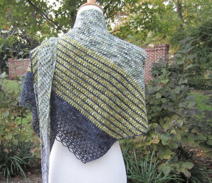 Grab four colors of your favorite fingering-weight yarn, and let's get started! Karena is worked from one small point beginning with just 6 chains. It is a biased piece with increases on one side and decreases on the other. The shawl gradually grows in length and width with both solid and striped sections for interest. Karena is finished with a fun, lacy border.