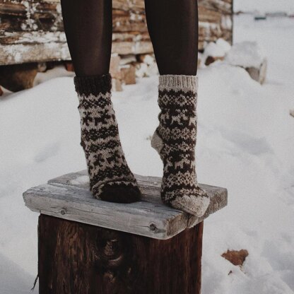 Karibou socks is a whimsical, cozy and wintry design inspired by the arctic animal - caribou. They are knitted top-down and in the round, featuring a stranded colourwork motif throughout. The heels are knitted using the afterthought heel technique.
