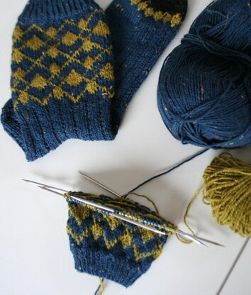 Karoso is a unisex sock pattern. The socks are knitted from the cuff down. After the colorwork part we work a broken rib pattern. The ribbed heel flap fits well. Before you start your toes, the colorwork pattern is picked up again and we change the color for the classic toes. This pattern is written to work on DPNs. You can easily adjust it for working on long circular needles. Enjoy it!