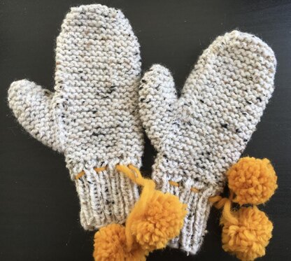 The Kartoffel mittens are the ultimate potato chip knitting. The mittens knit up really fast due to the aran weight yarn and the pattern is easy to memorize which makes it perfect for newer knitters. The contrasting pompoms add some fun and a bit of color. The garter fabric of the mittens is comfortable but not too bulky to go about your day wearing the mittens.