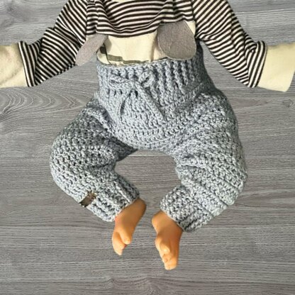 Create crochet baby pants and joggers for sizes Newborn to 24 months featuring a textured stitch worked seamlessly top down with no side seams. The sweater-coordinating design offers a flexible pull-on style and a neat finish for everyday wear and thoughtful handmade baby outfits.