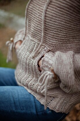 The Kaslo Campfire Sweater is a moderately easy sweater to knit! It is knit flat and then seamed together with the neck finished in the round. The main body of the sweater and sleeves are knit in garter stitch. These simple and squishy garter stitches are accented with finely detailed ribbing, elbow pads, I-Cord wrist and neck ties and a hoodie pocket.