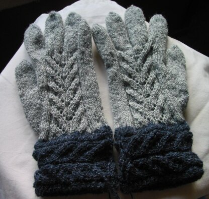 Two sizes are given in the pattern. Hand width is uniform, two lengths are given. also included are the rows for half finger gloves. Cuff is knitted first and then stitches are picked up for the body of the glove. Worked on DPNs Cuff has a seam.