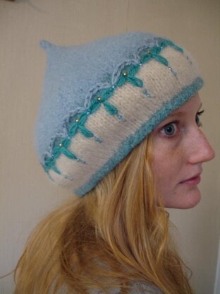 Easy knitting, once again, for a knitted and fulled hat of wonderful warmth and exotic style. The Katya Hat projects an air of mystery and is stylish whether embellished or not. Folksy embroidered details and beads add whimsical detail while gems and glitter go upscale for chic delight. Stripes can create playfulness and the Katya Hat's charm takes on a whole new aspect when worn by the male gender. Techniques include knitting on circular needles and double pointed needles at the tip. Look for fulling and blocking tips HERE and take a new tip on stabilizing the fabric which is included in the pattern. Yarn, needles for knitting and felting and roving are all available through the Ambrosia Cottage. Please consider joining the Ambrosia Cottage group here on Ravelry and feel free to personally message me within these links.