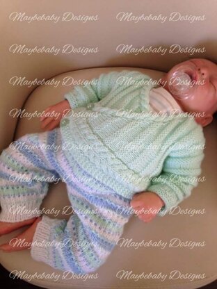 This Cardigan has a cable border at the bottom and a cable edge around the neck It has a slight unusual construction being worked sideways starting at the centre front edge and on the back from sleeve cuff to cuff The trousers have been worked in 3 colours but would work equally well in one or two.