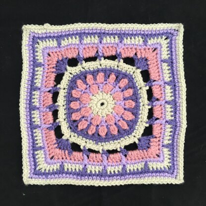 This square is designed to meet the 12 inch Worsted weight convention, but the featured photo is DK weight on a 4.5mm hook to produce a 8.5 inch square.