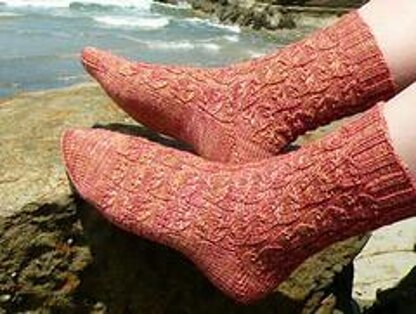 This top-down sock in four sizes is knit in a floral lace rib that extends down the leg and over the top of the foot like ribbons of tulips. Worked in a fi ner gauge, it makes a great lightweight sock for transitional weather.