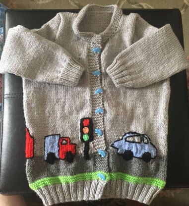 “Kevin” is an intarsia designed knitting pattern for a cardigan featuring vehicles. Includes knitting charts.