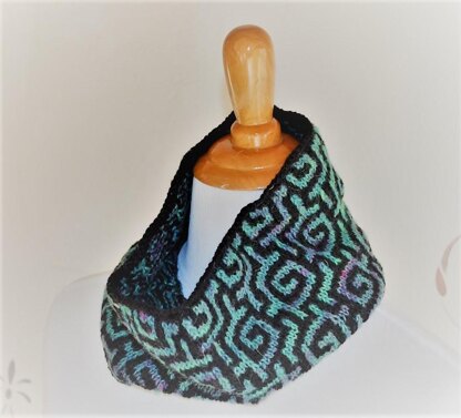 This cowl, which is worked in the round, represents a convergence of two techniques: slip stitch mosaics and the brioche stitch. Even though the cowl looks like it is worked using a stranded method, only one color is used at a time. The results create a reversible cowl that has two distinctly different yet attractive sides. One side looks like a traditional stockinette mosaic, but the fabric does not roll like traditional stockinette stitch. The other side reveals a textured effect with no loose floats. This unisex cowl is very warm, yet lightweight, and comfortable to wear. Very suitable for gradient yarns.