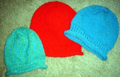 This is just what is says, Easy! This was designed for, and pairs well with Kids 2 Needle Mittens. An easy fit, little shaping creates a hat children will love! We love the roll brim then ribbing to hold hat in place. Then knit onward to finish hat! That is all there is to it. Just a few rounds of decreasing at top and you are done! One hat only uses about 2 ounces of worsted weight yarn, so this make a good pattern to use up scrap yarn. Make it colorful with stripes too. Fits from 2 to 9 yrs. Use a 16 circular needle, US # 7, and a few double points to decrease for top of hat. Dont worry. Our designs usually do not make you do many rows of decreasing on double points! Get started on these hats now, and keep in boxes for when you need a quick gift!